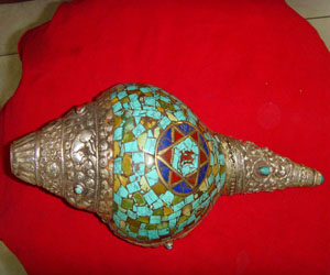 法螺是法会时吹奏的乐器之一。佛经上讲释迦牟尼说法时声音洪亮,有如大海螺的声音响彻四方,所以用它宋代表法音。听到法螺的声音,众生可以消除罪障,进入极乐世界。此外,在灌顶仪式上,也作为登上正觉的证明。法螺洁白细腻, 自然生长的螺纹主要是自左向右旋转,而法螺常用极为罕见的右旋海螺做成。(新浪)