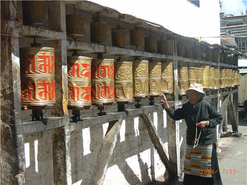 玛尼轮是佛教徒祈祷时用的法器。它的形状像小桶,中间有可以转动的轴,内部装有纸印的经文。祈祷的时候一面转动玛尼轮,一面口咏六字真言,以表示对佛的赞颂。这种玛尼轮要按顺时针转动,每转动一圈,就表示念咏了一遍经咒。与此功用相同的还有玛尼筒,在寺庙的屋檐下、佛殿的转角等地方设置了一排排玛尼筒,在西藏地区的屋顶上还可以看到许多利用风力转动的玛尼筒。密宗义理以超现实的手法,通过形形色色的玄妙而隐晦的宗教仪轨,寄托了超脱人世、脱离苦海的佛教出世观。历史上的无数僧俗、工匠、艺师出于那份获得善业功德的虔诚,制作了难以计数的法器,这些法器具有独特鲜明的艺术观赏性和审美意趣,堪称藏传佛教艺术的一朵奇葩,在绚丽多彩的藏民族艺术百花园中熠熠生辉。(新浪)