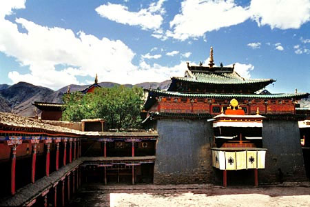 此外寺内还藏有四宝:一是由小木板镶嵌而成的拼经板,约二尺见方,共有一百零八块。 来此朝佛的人皆以能得到一张拼经板的拓片为幸。第二件宝物是大殿内的一个铜坛,坛内装圣水,平日用红布封口并加封条,每十二年开封换水一次,若得一杯圣水,即可洗净一百零八种污垢。第三宝是大殿门口放的一块盆状巨石,据说曾是建寺喇嘛的洗脸盆,并传说此盆在雨天接满雨水后,雨水无法倒出来。第四件宝贝是一块刻有六字真言和四个小塔的石板,传说是在建寺破土时发现的,因此成了本寺的根基。这四件宝物是夏鲁寺的镇寺之宝,世代相传至今。(人民网)
