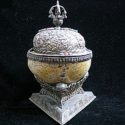 嘎巴拉碗为修密宗无上瑜伽密举行生起次第时用的法器。嘎巴拉是梵文的藏译,意思是颅骨。嘎巴拉碗用人的头盖骨做成,大多是依照高僧大德生前遗嘱,从其遗体上取下后制成的。它是西藏佛教中常用的法器之一。(新浪)