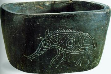 猪纹钵是一件典型的盛食器,这类盛食器与人们日常生活关系密切。这件典型的陶钵是在1973年浙江余姚河姆渡出土。整个器形呈长方形,四角弧圆,平底。夹炭黑陶制成。器高11.6厘米,长21.2厘米,宽17.2厘米。在钵外壁分别以写实的手法,均匀的线条刻绘了猪纹,该猪整个造型形态逼真,四足蹒跚而行,头向前垂,双目圆睁,正在寻觅食物。长条形的腹部微微发鼓,身刻圆圈纹和叶纹。猪的鬃毛簇立,小尾下卷与身腹上的图案混为一体,相当协调。这种艺术处理,充分反映了河姆渡人艺术构思的奇特和审美情趣的淳朴。从这个猪的刻绘造型,表明了河姆渡人在原始绘画艺术的技巧上已相当熟练,绘制的笔法也十分简练,不仅猪的形象逼真,而且神韵天真。所以说它是一件朴质的实用器,也是一件不可多得的精致的艺术品。对研究河姆渡文化的陶器制作、原始绘画艺术和七千年时河姆渡人饲养猪的模样等提供了实物数据。