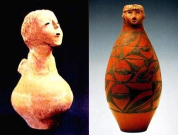 1973年甘肃秦安邵店大地湾出土的人头形红陶壶、1975年秦安寺嘴人头形彩陶瓶