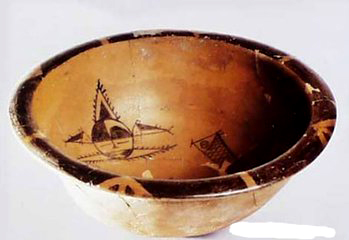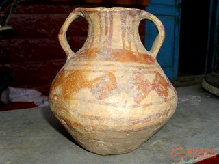 4、庙底沟型彩陶:仰韶文化中的一种,因在河南陕县庙底沟发现而得名。它晚于半坡型彩陶。器型以大口鼓腹小平底钵为最典型。此外还有敛口浅腹盆、敛口罐、长颈罐、重唇尖底或平底瓶等。彩绘主要用黑或紫黑色,纹饰有几何形图案,如圆点、勾叶、弧线、三角带状纹、平行条纹、回旋钩连纹、网格纹等。同时也有仿生纹和植物纹等。