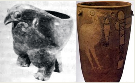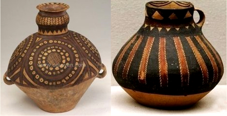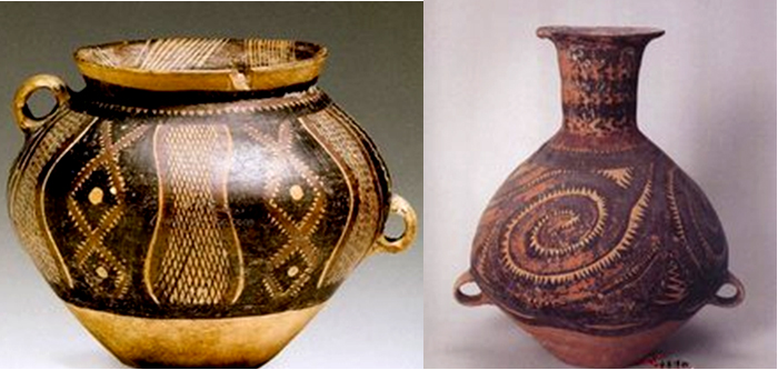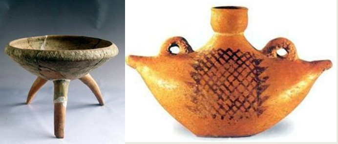 左:河南陕县庙底沟出土的黑陶鹰鼎 右:1978年出土于河南省临汝阎村出土的鹳鱼石斧图彩陶缸