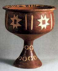 此件八角星纹彩陶豆,1978年出土于山东泰安大汶口遗址。口径26厘米,足径14.5厘米,通高28厘米。材料为泥质红陶,豆盘为圆唇斜口、深腹,喇叭形高圈足;腹和圈足部位涂抹了一层深红色陶衣,斜口沿面绘白色彩地,其上用褐、红等彩色绘出半月形与若干竖线段相间组成的图案,腹部用白彩在深红色陶衣之上绘五个方心八角星状纹样,各八角星之间同样用两列白彩竖线段间隔。彩陶豆上的八角星纹,有学者认为这类纹饰有表现光芒四射的太阳,四射的八角也寓意着无际的天空。圈足部位绘两圈褐色彩带,彩带之上用白彩绘贝形纹样。纹饰构图对称,色彩对比强烈,堪称我国彩陶艺术珍品。