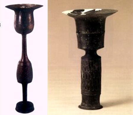 这两件出土于山东省胶州市三里河遗址的高柄杯,均为黑陶,胎壁极薄。其中高者高22、6厘米,口径9厘米。为盘口,中腹与杯体相连,呈竹节状,共十一节。下为喇叭形圈足,圈足较高,上与杯腹相套接。器表乌黑光亮;宽斜口沿,深腹杯身,细管形高柄,圈足底座;杯腹中部装饰六道凹弦纹;细柄中部鼓出部位中空并装饰细密的镂孔,貌似笼状,其内放置一粒陶丸,将杯子拿在手中晃动时,陶丸碰撞笼壁会发出轻脆的响声,杯子站立时,陶丸落定能够起到稳定重心的作用,设计十分巧妙。造型体态轻盈,挺拔秀丽,制作技艺美妙,是一件古代艺术珍品。