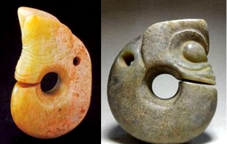 上个世纪三十年代,在辽宁喀喇沁左翼蒙古族自治县东山嘴和建平县牛梁河两地发现大型祭祀遗址和女神庙。在女神庙下方不远的山坡上,发现有大型的方形、圆形祭坛。祭坛周围有许多用石板砌成的石棺墓。死者身上及周围随葬着玉璧、玉环,玉箍和玉棒,尤其是死者胸前一对兽型玉饰尤其引人注目。因为兽型玉饰以前也多有发现,皆被判定为商代玉器。直到在红山文化墓葬中这位一个死者胸的这对兽型玉饰,才被判定是红山文化的产品。