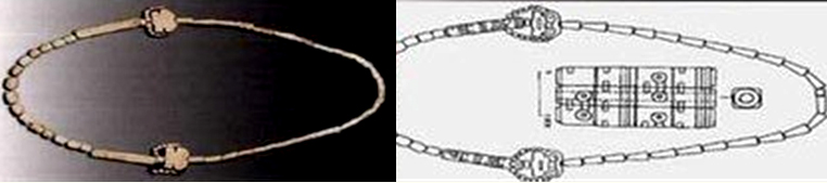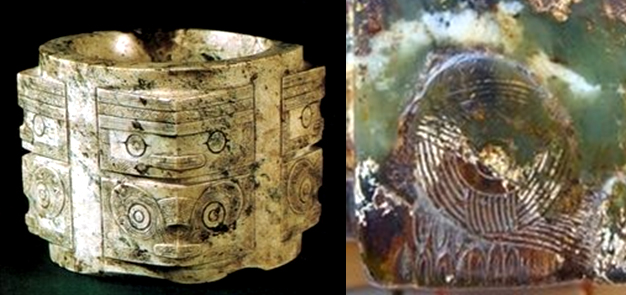 左:江苏新沂县花厅新石器时代遗址16号墓出土的良渚玉项饰 右:示意图