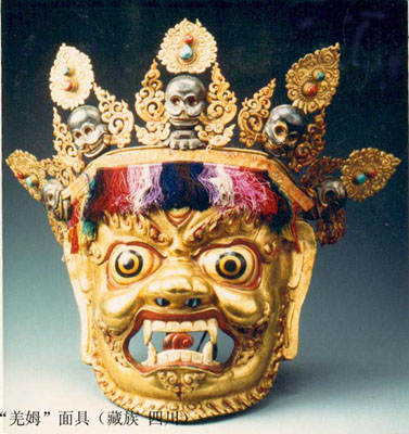 “羌姆”跳神面具是印度高僧莲花生大师吸收了西藏早期的土风舞,结合佛教密宗的金刚舞,逐渐发展起来的神舞面具。跳神面具属宗教面具,品种有皮、木、铜、泥、漆布等各类。