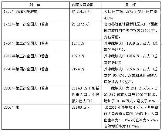 1951年和平解放以来,西藏人口,尤其是藏族人口进入有史以来增长最快的时期,自1956年以来,西藏的人口出生率、自然增长率均高于全国的平均水平。根据1%人口抽样调查资料推算,2006年末,西藏总人口为281万人,其中藏族人口占总人口的92%以上。与1951年西藏和平解放时的114.09万人相比,人口增加166.91万人,人口出生率为17.4%,死亡率为5.7‰,自然增长率为11.7‰。人口平均寿命从35.5岁提高到了现在的67岁。据西藏自治区老龄工作委员会最新统计表明,目前西藏281万人口中,有80岁至99岁的老人19500多人,而百岁以上的老人有79人,这是西藏历史上百岁老人最多的时期,已成为全国百岁老人最多的省区之一。