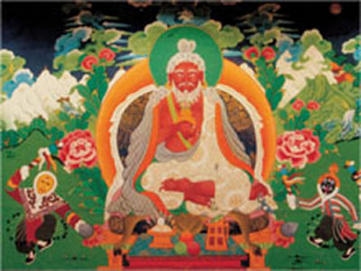 汤东杰布虽然是十四五世纪的历史人物,但民间有很多关于他是戏神的传说。如说他在母亲腹中怀孕达六十年之久,生出来就是白胡子、白眉毛、白头发的老头婴孩。说他有一大在一个高旷的荒原上修禅人定后,从天空降下红、黄、蓝、白、绿五色神女,并围绕着他轻歌曼舞,一个神女一句唱词,合起来的意思为:“广袤无边的高旷大坝,瑜伽行者得悟其空性,像无畏国王跌坐坝上,汤东杰布你从此得名。”这实际上是一首嵌字诗,第一句中“大坝”藏语音为“汤”;第二句中“空性”藏语音为“东”;第三句中“国王”藏语音为“杰布”,三句合起来为“汤东杰布”。“汤东杰布”是个尊号,意思是说他是个能端坐于高旷大坝修行得道的瑜伽师国王。