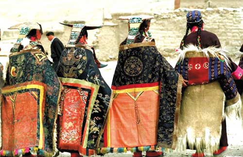 荣琼妇女的传统服装很有特色,一般为毛织品制成的黑色长袍,开襟不像一般的藏装在侧面而是在正面,边上镶有红、黄相间的花边。更为特别的是,有一种本地称为“央律”的披肩,用皮或毛织品制成,展开为正方形,一般底色为红色、黄色或黑色,上面绣有各种花纹,令人想起古格红殿天井上美妙绝伦的装饰花纹。有的披风上还挂有小铃铛,妇女们外出汲水或干活时,便发出一阵阵轻松悦耳的叮当声,为日常劳作带来一种悠深的韵味。