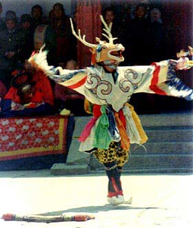 紧接下来的是,一组组具有专题宗教内容的神祇舞蹈,如突出显示神灵无上威力的“法神舞”、“凶神舞”、“金刚神舞”,表现地狱中小精灵们相互玩耍、嬉戏的“骷髅舞”,为人间带来福禄的“鹿神舞”,宣扬乐善好施、长命富贵的“寿星舞”、“仙鹤舞”,以及表演佛经中“舍身饲虎”、“因果报应”等佛经故事的舞段,令人目不暇接。
