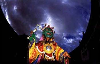 要说起藏传佛教寺院舞蹈《羌姆》的来源,就必须追溯到藏传佛教在西藏得以兴起的经过。那是在公元 7世纪时,印度高僧莲花生来到西藏宣传当时流行于印度的佛教。然而,西藏当地原始多神崇拜的“笨教”深入人心,对外来宗教采取排斥、拒绝的态度。为了能在西藏推行佛教,聪明的印度高僧莲花生便采取了将印度佛教与西藏原始苯教相互结合的方法,既保留了佛教教义、对唯一最高主神如来的崇敬,又将笨教中的各种神灵收纳为护法神,而符合了藏族对原始多神进行崇拜的心理,至使西藏地区在唐代诞生了藏传佛教。