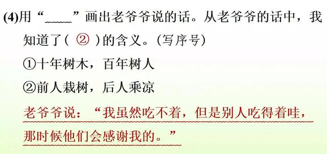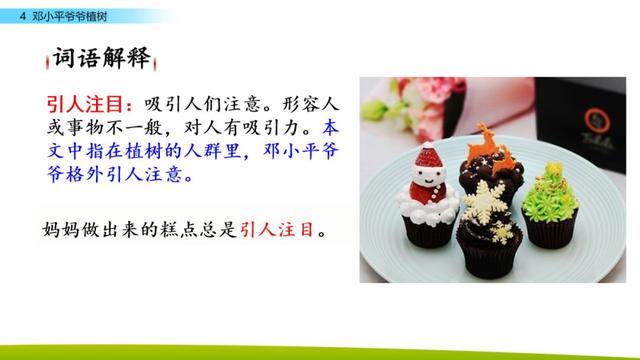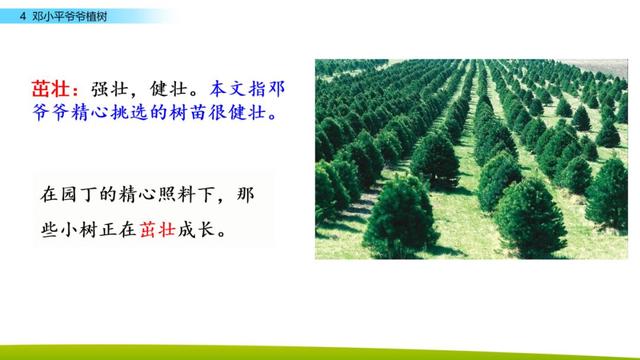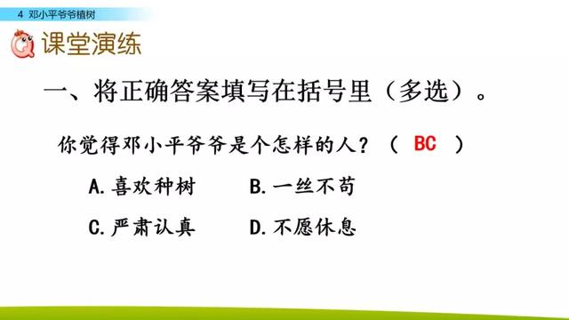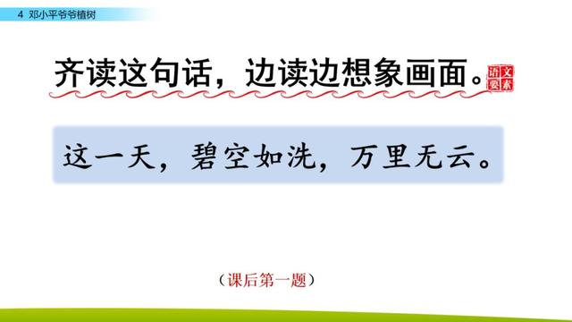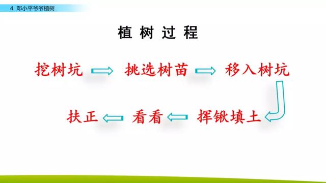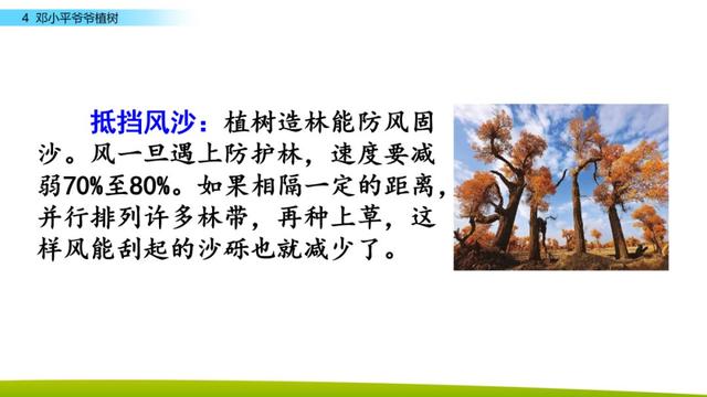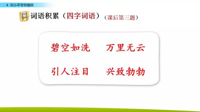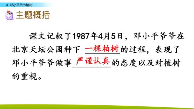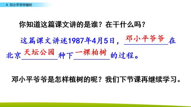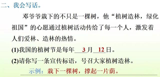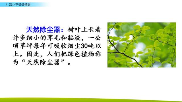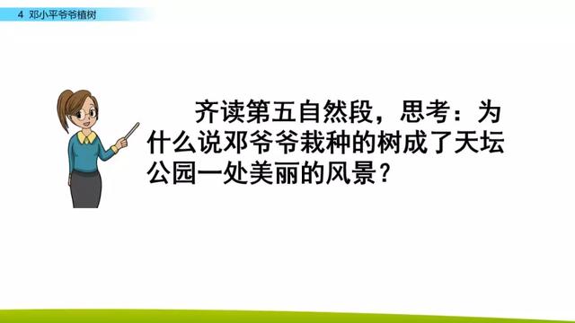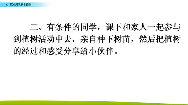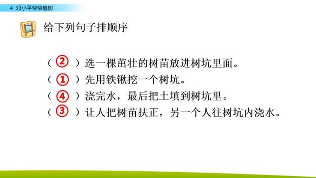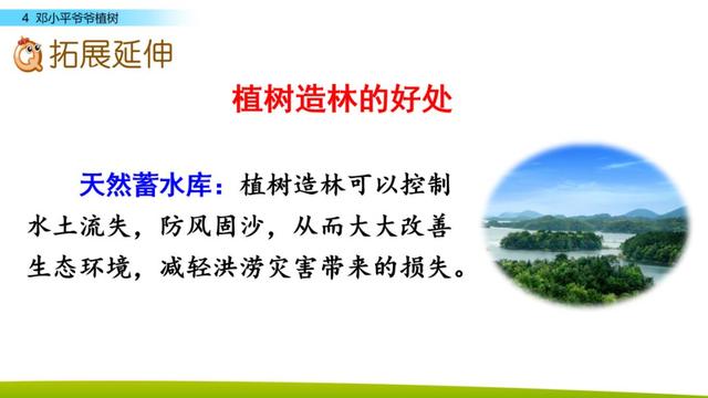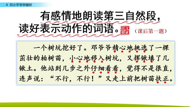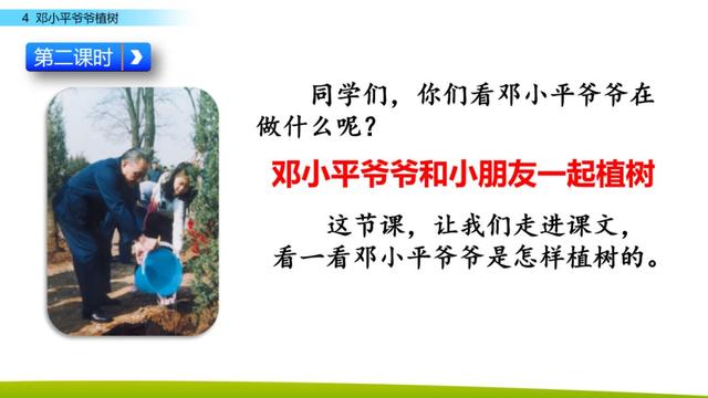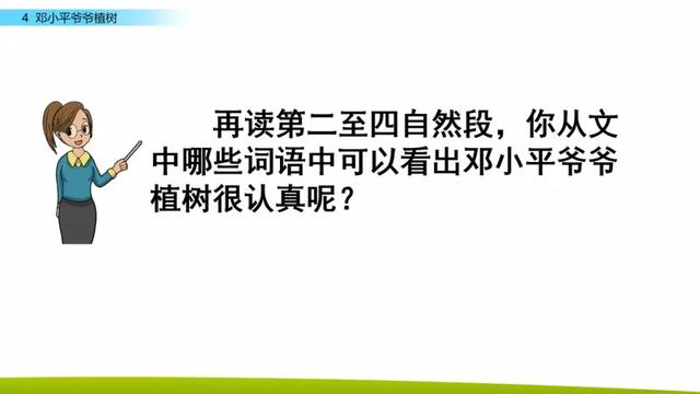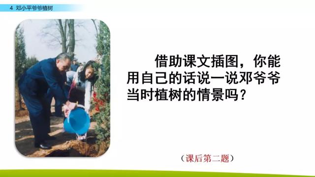 2、默读第3自然段。借助插图,说说邓爷爷植树的情景。