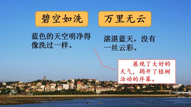 点拨:这是本课出现的几个成语,其中,前两个词语是形容天空的词语。注意“注、致”是翘舌音,不要读成平舌音。充分体现了文中用词地准确,我们要读一读,理解词语的意思,并记一记,用在以后的习作中。