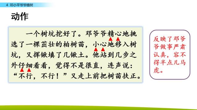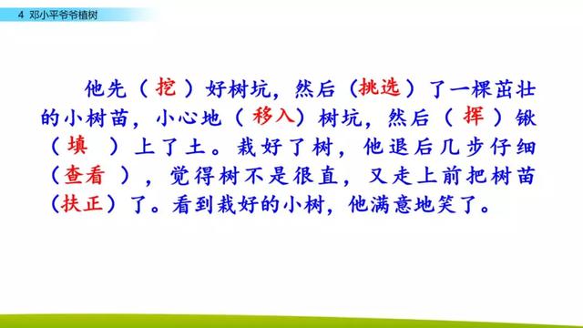 参考答案:邓爷爷植树非常认真,一丝不苟。他先挖坑,再精心地挑选树苗,然后挥锹填土,最后仔细一看树苗不直,就又把树苗扶正。