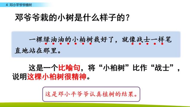 一棵绿油油的小柏树栽好了,就像战士一样笔直地站在那里。邓爷爷的脸上露出了满意的笑容。