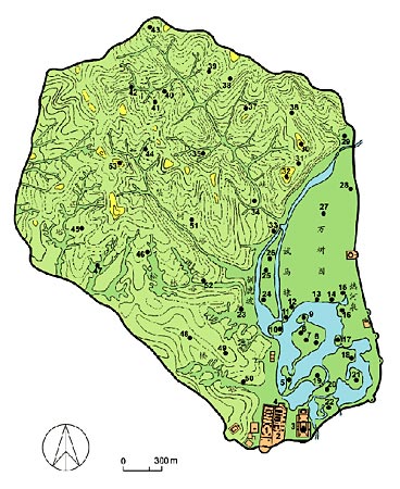 避暑山庄位于武烈河西岸,占地面积560公顷,四周环以围墙,长达10公里。园内地形变化复杂,可划分为四大景区,即宫廷区、湖沼区、平原区、山峦区,分别表现出不同的景观特色。宫廷区由正宫、松鹤斋、万壑松风、东宫等四组建筑组成。正宫为清帝理政、晏居的地方。根据封建帝王前朝后寝制度,依中轴对称布局原则,布置了午门、正宫门、澹泊敬诚殿、四知书屋、万岁照房、烟波致爽殿、云山胜地楼、岫云门等一系列殿寝建筑。松鹤斋一组建筑为奉养太后的居地。万壑松风在松鹤斋之北,后濒下湖,为宫廷区与湖沼区的过渡性建筑。东宫是清帝举行庆典宴会之所,主要建筑有清音阁、福寿园、勤政殿、卷阿胜境殿等。为配合“山庄”这一主题思想,宫廷区的殿、堂、室、楼都采用朴素简洁的北方民居建筑形式,不用琉璃瓦及彩画进行装饰。湖沼区在宫廷区之北。大小有七个湖泊萦绕,形成了如意洲、青莲岛、金山、月色江声岛等几个较大的岛屿,岛间又以长堤、桥梁串联,云水苍茫,动静各异,构成以水景为主要题材的景区。康熙、乾隆曾几次到江南浏览名山胜水,对其玲珑典雅的写意山水园林深为赞赏,所以在山庄中仿建数处。如文园狮子林是仿苏州狮子林,天宇咸畅是仿镇江金山寺,青莲岛烟雨楼仿嘉兴烟雨楼,沧浪屿仿苏州沧浪亭等。湖沼区的景点多因水面景色之感发,意念与环境之交融而组成景色画面,极富于诗情画意。湖沼区布局自由灵活,匠师们通过几条有组织的观赏路线把分散的景点串联起来,作有秩序的动态观赏。平原区位于湖沼区之北。包括有万树园、永佑寺诸景,以及西部山脚下的宁静斋、千尺雪、玉琴轩、文津阁诸建筑。其中以万树园最具特色,在数百亩草地间,苍松翠柏,郁郁葱葱,独具北国草莽风光。乾隆时经常召见各兄弟民族政教首领来此野宴,看焰火,放河灯,看马戏杂技等。山峦区在山庄西北部,占据山庄绝大部分,用地430公顷。其中包括有松云峡、梨树峪、松林峪、榛子峪、西峪等数条峪谷。起伏山峦成为湖沼区及平原区最好屏障,阻挡住冬季西北风的侵袭。山峦区园林布置的特点是最大限度地保持山林的自然形态,穿插布置一些山居型小建筑,不施彩绘,不加雕镂,清雅古朴,体量低小,并呈散点布置,远远望去完全淹没在林渊树海之中。其中最引人入胜的是松云峡,数里长峡遍植松柏,一路之上松涛鸟语,满目青翠,层峦叠嶂,云雾迷蒙,使人们完全进入一个幽静清绝的境界之中。