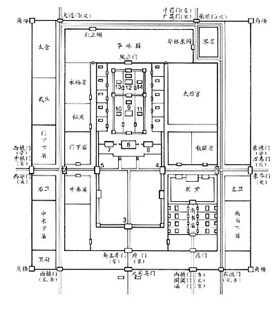 1,东止车门 2,西止车门 3,端门(晋)、太阳门(梁)、南中华门(宋) 4,云龙门(晋、齐)、东中华门(宋)、万春门(梁) 5,神龙门(晋、齐)、西中华门(宋)、千秋门(梁) 6,太极殿 7,太极西堂 8,太极东堂 9,式乾殿(中斋) 10,西斋 11,东斋 12,显阳殿 13,徽音殿 14,含章殿1 11月