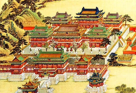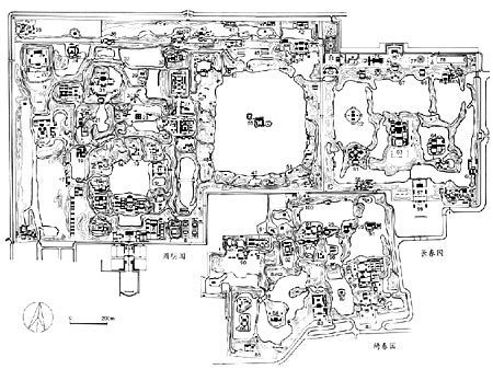 此园原为雍正皇帝为皇子时的赐园,待其即皇位以后扩建为离宫,乾隆二年(1737年)再次扩建,乾隆十六年(1751年)和三十七年(1772年)先后又附建长春园和绮春园,合称圆明三园。它坐落在西郊海淀镇之北,周围泉眼丛聚,草丰树茂,是绝好的造园之地。三园共占地350余公顷。园内成组的建筑群有一百二十三处,被誉为“万园之园”。咸丰十年(1860年)英法联军占领北京,圆明园惨遭劫掠焚毁。