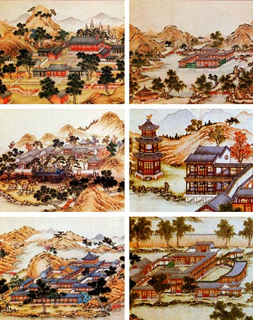 长春园是圆明园的附园,在圆明园的东侧。此园分为南北两个景区。南区以淳化轩一组为主体建筑,周围湖岛布置了十个景点,皆因地制宜,因水成景,如茹园、鉴园、狮子林、海岳开襟、玉玲珑馆等。北区为一横长地区,区内布置了六幢欧洲18世纪巴洛克风格的宫殿式建筑,名为谐奇趣、蓄水楼、养雀笼、方外观、海晏堂、远瀛观,俗称西洋楼。这些建筑的体形及立面上的柱式、檐口基座、门窗细部俱为欧式建筑作法,但细部雕饰也掺杂了中国式的纹样。建筑前还配有人工喷泉。西洋楼建筑是欧洲建筑文化第一次传入中国的完整作品,也是欧洲与中国两大园林体系首次结合的创造性尝试。绮春园也是圆明园的一个附园,是多座私家小园合并扩建而成的,共计三十景。总体布局不拘泥一定章法,但更富于自然情调。景与景之间疏密相间,水系也比较错综复杂,形成小巧玲珑的格局。