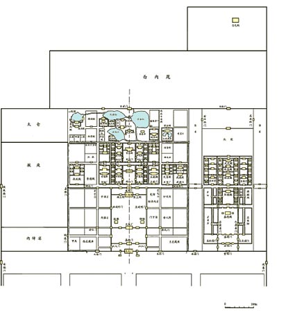 隋大兴宫即唐改称的太极宫,在长安中轴线北端。近年已经过勘探,其东西宽2820米,南北深1492米,分为中、东、西三部。中部为皇宫,即大内,东西宽1285米,面积1.92平方公里。东部为太子东宫,宽833米,西部为服务供应部分及作坊掖庭宫,宽703米。大内部分自南而北分朝区、寝区和苑囿三大部分。朝区为处理国政、举行大典的办公区,象征国家政权;寝区是皇帝的住宅,代表家族皇权。朝区正南为宫城正门承天门,是元旦、冬至举行大朝会等大典之处,比附周代宫殿之“大朝”或“外朝”,门外左右建高大的双阙,阙外为朝堂。门内正北为朝区主殿太极殿,是皇帝朔望(初一、十五两日)听政之处,比附周代宫殿之“中朝”或“日朝”。殿四周有廊庑围成巨大的宫院,四面开门,南门为太极门。太极殿一组宫院之东西侧建宫内官署,东侧为门下省、史馆、弘文馆等,西侧为中书省、舍人院等。太极殿后为宫内第一条东西横街,是朝区和寝区的分界线。横街北即寝区,正中为两仪门,门内即寝区正殿两仪殿,也由廊庑围成矩形宫院。此殿是皇帝隔日见群臣听政之处,比附周代宫殿的“内朝”或“常朝”。两仪殿东有万春殿,西有千秋殿,三殿都各有殿门,由廊庑围成宫院,与两仪殿并列。两仪等殿之北为宫中第二条东西横街,街东端有日华门,街西端有月华门,横街北即后妃居住的寝宫,大臣等不能进入。此部分正中为正殿甘露殿,殿东有神龙殿,殿西有安仁殿,三殿并列,以甘露殿为主,各有殿门廊庑形成独立宫院。前后两列,每列之殿是寝殿的核心,有围墙封闭,其中两仪殿和甘露殿性质上近于一般邸宅的前厅和后堂。甘露殿之北即苑囿,有亭台池沼,其北即宫城北墙,有玄武门通向宫外。在朝区门下省、中书省和寝区日华门、月华门之东西外侧,还各有若干宫院,是宫中次要建筑。朝寝两区各主要门殿承天门、太极门、太极殿、两仪门、两仪殿、甘露门、甘露殿等南北相重,共同形成全宫的中轴线。太极宫各殿宇压在今西安市下,无法做进一步勘探,目前只能据文献做出平面关系示意图以知概况。