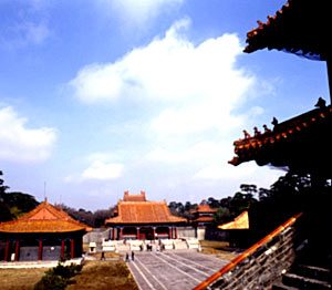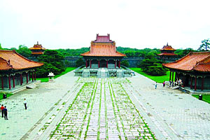 再向北便是城堡式的方城。南面的正中是隆恩门,上建三层歇山式的门楼建筑。方城的四角各有一座角楼,城内正中是坐落在须弥座式大台基上的隆恩殿,是单檐歇山式,殿内供奉着木主神牌,殿前有焚帛楼,殿的东西两侧各有配殿五楹。殿的后边有洞门,洞门之上建有重檐歇山式的大明楼,中间立有“太祖高皇帝之陵”的石碑。方城内的建筑,屋顶都铺有黄琉璃瓦,廊柱是朱红地仗,梁枋间都是“和玺”壁画。方城之后是月牙城。前壁的正中有琉璃一座照壁,其后是圆形的宝城。宝城的正中是圆形的宝顶,下面就是埋葬灵枢的地宫。福陵的周围,河流环绕,山岗拱卫,望去气势宏伟,景色幽雅,风景优胜。清人高士奇曾有诗云:“回瞻苍霭合,俯瞰曲流通。地是排云上,天因列柱崇。”正是这里风光的具体写照。“天柱排青”是著名的沈阳八景之一。