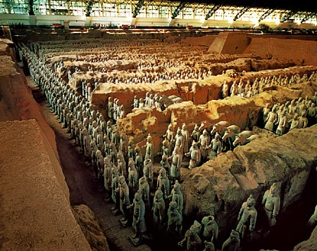该陵墓位于今陕西临潼县东的骊山。平面为具南北长轴之矩形,有内垣、外垣二重,四隅建角楼。但陵墓本身主轴线为东西向,且主要入口在东侧。外垣南北宽2165米、东西长940米。内垣南北宽1355米、东西长580米。陵墓封土在内垣南部中央,为每边长约350米的方形,残高76米。陵垣由夯土筑构,墓宽约6米。外垣每面开一门,共四门。内垣五门(北面开二门,其他三面各开一门,并与外垣门相对)。在封土以西发现大小夯土堆多处,当为官署及附属建筑。封土东北,有贵族陪葬墓二十余座。外垣东门大道北侧,已发现巨大的陶俑坑三处,内置众多的兵马俑及战车,当系秦始皇的地下仪仗及守卫。构造精美、外观华丽之铜马车及战车,则位于封土之西侧。此陵墓形制宏巨,规模空前,创造了中国古代帝王陵寝的新形式,影响及汉乃至后代之唐、宋。