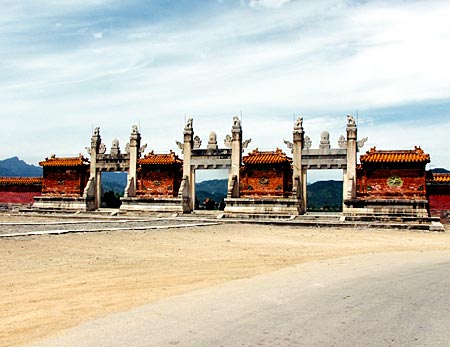 清代东、西陵建筑完全是继承了明代陵制,这在选址、轴线布局、方城明楼的布置及石象生设置等方面都可以得到印证。如清东陵选在昌瑞山南坡,昌瑞山中峰突起,两侧山峰层层低下,犹如一道屏风,十五座陵寝各依山势东西排开,山前48平方公里的原野,坦荡如砥,西为昌瑞山余峰,东为起伏的丘陵。腹地有河流穿行,正南面有天台山、烟墩山对峙,形成一个天然的陵口——龙门口。这种向阳、避风、防洪的背山面水的大空间,完全符合风水理论所要求的陵寝吉地佳壤的山川形势,即要呈现开帐、拱卫、宾主、朝揖、水脉分流、堂局开阔、树木葱郁、气候湿润的地形地貌,证明东陵选址原则与明代十三陵的选址完全一致。清代各陵的礼仪建筑设置如碑亭、石象生、隆恩殿(明代称裬恩殿)、方城明楼等,皆按轴线展开,形成有序的空间层次。这种轴线安排是以远景、对景为依据,并不是固定方向不变的直轴,达到“前后照应”、“返顾有情”的效应,亦与明陵的意匠相通。有关方城明楼的形制,在入关以前诸陵中有强调城堡形象的意图,但入关以后接受了明陵设计中以隆恩殿与明楼为建筑主体的构图。又如石象生采用动物及文武臣两种系列,每一对石象生动物皆取立卧两式,亦是效仿明制。四角立望柱,以强调“神功圣德碑亭”地位的手法,也是学习明陵神道的处理。