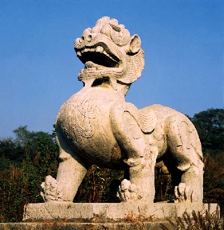 石兽有二种,一种躯体较瘦,头足较长,身上雕刻较多纹饰,只用于帝陵,一般称麒麟。另一种躯体肥壮,短颈长鬣,略似狮子,身上无多雕饰,只用于王侯墓,一般称“辟邪”。现存麒麟以梁武帝陵前的最大,长3.32米,腰围2.4米,高2.7米,下有矩形座,为整石雕成,异常壮伟。