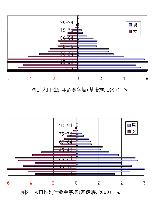 从各年龄段的人口比例看,少年儿童人口(0-14岁)比重为28.87%,劳动年龄人口(15-64岁)比重为65.89%,老年人口(65岁及以上)占5.24%,与1990年相比,少年儿童人口比重下降了5.15个百分点,劳动年龄人口比重和老年人口比重分别增加了4.34和0.81个百分点。1990年和2000年基诺族人口的性别年龄结构如图1和图2所示。
