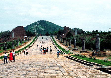 垣后,双阙前耸,神道步步高升,直指主峰,左右翠柏环拥,极大地衬托出主峰陵墓的气势,也就有力地表现出墓主的盛大功业,是中国古代陵墓选址最成功的例子之一。