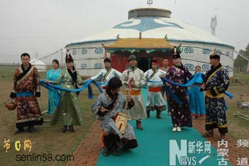内蒙古正蓝旗一家牧民开办的旅游点上,身着盛装的蒙古族姑娘、小伙子手捧哈达、美酒迎接远方的客人。(布和朝鲁 摄)