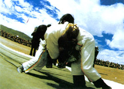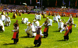 前面所说的僧人的节日并不一定限于僧人才能过,事实上许多节日僧人与老百姓共度。反过来,不同地方的老百姓也有很多各不相同的节日。比如在日喀则西部的昂仁县桑桑草原,牧民们就有一年一度的割草节。桑桑草原割草节是西藏其他地方没有的,日期并不固定,但大致都在藏历七月,要根据季节、气候、藏历的吉日等因素决定。割草区是多年来专门划定的,组织工作也全由民间承担。割草节那天,数百顶帐篷拔地而起,一改往日草原上人烟稀少的景象,到处是熙熙攘攘的人群。男人们为比赛做准备,女人则穿戴一新,青年男女相互约会,孩子们互相追打,商人们则忙于生意,热闹异常。这种繁荣景象持续到五天后割草节结束。那些帐篷会在一夜之间消失得无影无踪。