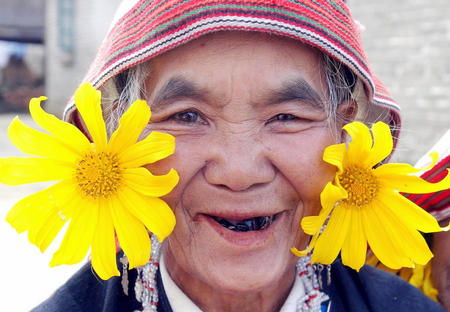 云南省西双版纳傣族自治州基诺族乡亚诺寨72岁的基诺族老人沙麦高兴地将金黄色的太阳花插入耳环洞内,让“太阳”贴在脸上。