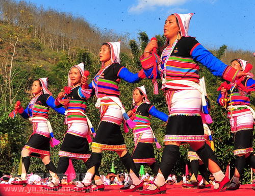 2月5日,基诺族乡乡村代表队演员在表演。 2月5日至8日,居住在云南省西双版纳傣族自治州景洪市基诺山的基诺族乡1万多基诺族群众欢度一年一度的“特懋克”节,同时举办乡土特色的基诺族原生态民间歌舞乐比赛,全乡7个村委会的46个村代表队带来了80个节目参赛。 新华社记者 陈海宁 摄