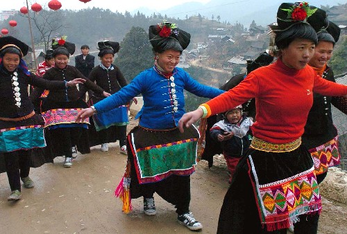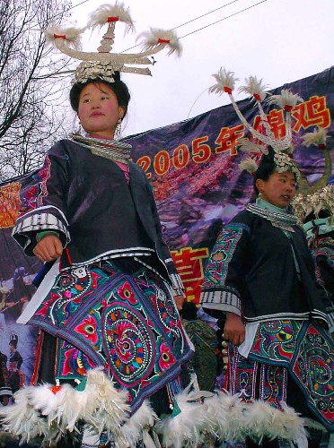 几位身上缀满鸡羽的苗族姑娘在表演有上千年历史的苗族锦鸡舞。