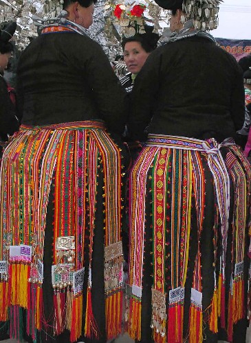 苗族妇女在展示仿照锦鸡尾羽做成的裙子。
