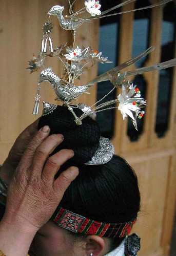 一位母亲在为准备参加节日活动的女儿佩戴锦鸡形状的头饰。