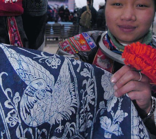 一位苗族姑娘在向旅游者介绍苗族蜡染中的锦鸡图案。