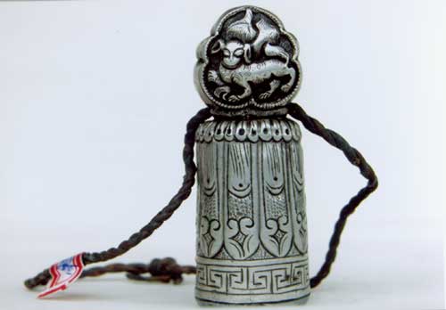 西藏印章是中国印章史上极赋魅力的瑰宝,它所包含的历史、人物、政治、宗教的深度和广度以及文字、图纹、材质的千姿百态都堪称一绝。印章既是历史的见证,权力的象征,又是多种艺术的综合体现。有了印就有了权,不管是世俗的还是宗教的,得到了世俗的封印,就可以成为某一地区的统治者;得到了宗教的封印,也就成为某一教派的领袖人物。