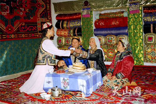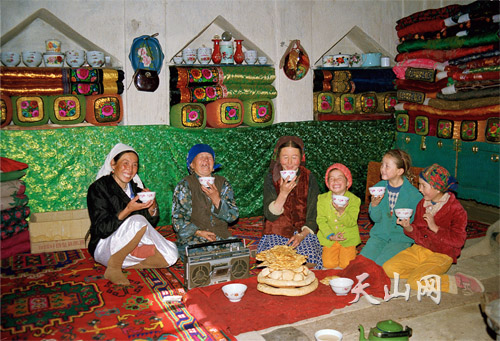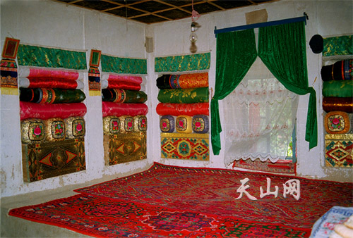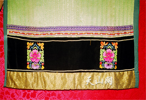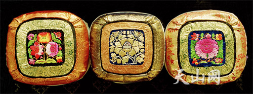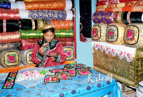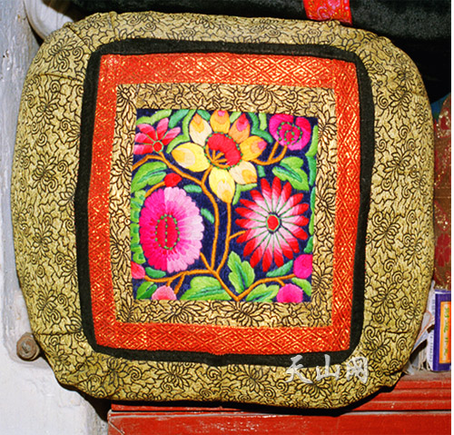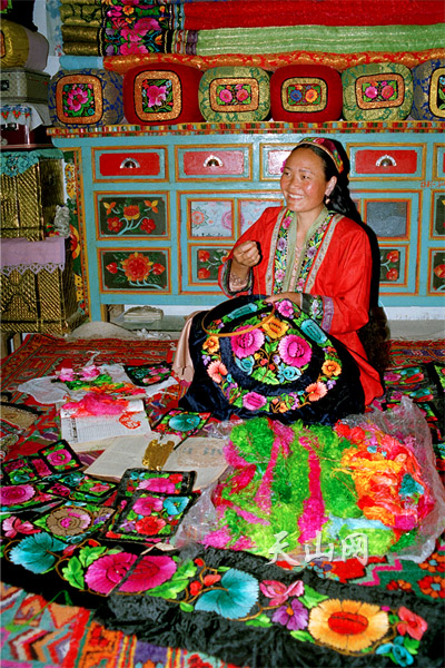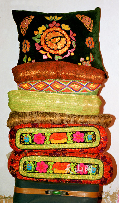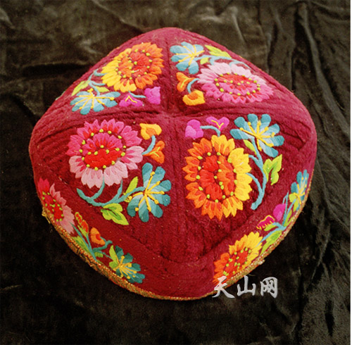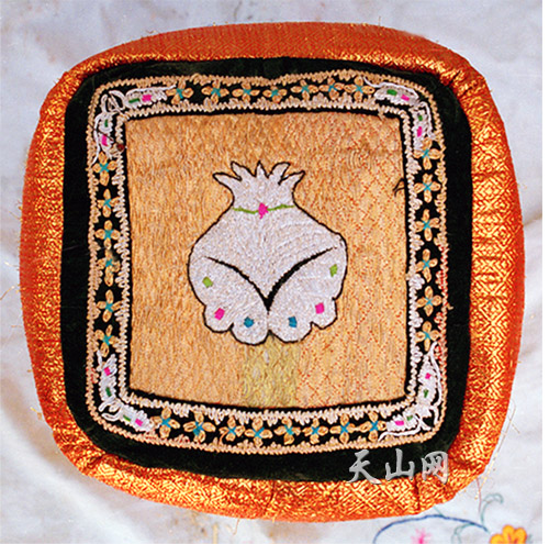 哈密维吾尔民间的刺锈多以花草为主题的象征图案构成,但图纹布局疏密合理、密而不乱,红花绿叶,色彩艳丽。色调热烈活泼的哈密花帽。根据性别、年龄、性格等因素,采用不同的底色面料,大同中显出小异:服装有长袍、短袄、坎肩等,其衣领、袖口和周边大多绣有古朴庄重的各色图案,显得和谐而华贵;哈密枕头呈四棱长方型,两头为方型枕面,以各色绸缎、平缄作底,黑色布料沿边,中绣花卉图案。平时整齐地排列于炕柜上。与罩单等共同构成室内装饰美。哈密刺锈不仅体现生机勃勃的绿洲景色,而且还饱含浓郁的民族风格,流露着民族的审美心理。(摄影:郭晓东)