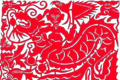 苗族民间剪纸的独特之处还表现在构思的新颖奇妙上。如《姜央兄妹合磨成亲》图,艺人为了扩大意境,打破了时间与空间的限制,把发生在不同时间与空间的事物描绘在一幅画面上。你看,作者大胆而巧妙地把画面分成天空、山顶和山脚三部分,来表现三个不同的情节。天上飞的是蝴蝶和山鸡,山顶上站着拍手叫好的姜央,山脚下站着姜央的妹妹以及已合上了的石磨,还有被从山顶上滚下来的石磨吓惊了的野兔。这幅画面生动形象地描绘了洪水泛滥后,地上的人都被淹死了,姜央和妹妹藏在葫芦中幸免于难,为了繁衍人类,兄妹只好成亲等情节,非常巧妙地使这一远古传说得到精致的再现。又如三接式袖花剪纸图案,画面中间是双象斗兽,上方是人驯蚕身龙,下面是龙象相争,其余空处是鱼鸟虫蝶。这种奇特的构思,把原始社会人与自然的关系表现得淋漓尽致。另外,苗族妇女在构思时,把自己的观念意识、审美情趣注入其中,而不是机械地照搬生活现象。如袖花剪纸图案《狮子笛童》,描绘是一个笛童坐在已受过驯养的雄狮上,悠然吹笛,笛声阵阵,婉转动听,雄狮洗耳恭听,众雀乌、蝶群也纷纷飞来,整个画面体现了人与自然友好相处的情态,充满了和谐,充满了吉祥,使人仿佛处在神话般的境界中。