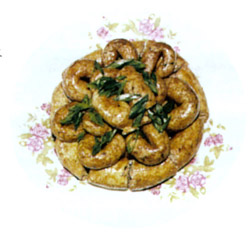 达赖、班禅的饮食。放少量酥油在面粉中,将碎肉包在面里,然后放到酥油中炸熟即可食用。