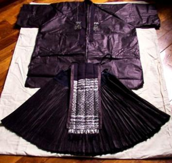 苗族锡绣制品的前后裙片背搭不仅图案有所区别,而且在工艺流程上也不相同。前裙片的制作是先在未经浸染的白色棉布上用黑色棉线将图案绣成,然后浸染浆制, 最后将图案上的棉线挑出,再用小锡片将其包裹并镶边而成;后裙片及背搭所用的面料则是用预染好的彩色棉线(暗色调)按一定的图纹织成.底纹绣制分两道工序,先用单色棉线按传统图案刺绣,然后用彩色丝线(暗)在图案的空隙补绣其它花饰,锡片沿单色图案包裹完成后,其效果是在锡纹的间隙中还可见到丝线绣制的彩色暗花。