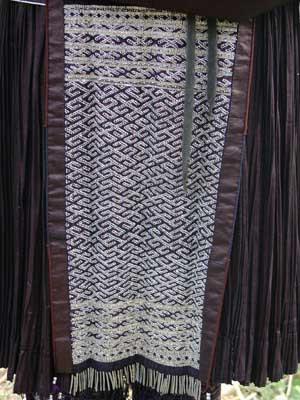 背搭苗语为“圣欧”,花纹长约20厘米,宽约17厘米,主体图案与前后裙片大体相同,锡绣间有用丝线点缀的暗紫色小方块暗花,同时下方吊有一排分三节用10厘米锡条包制的锡线,称为滴水线,表示屋檐的滴水。