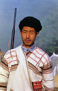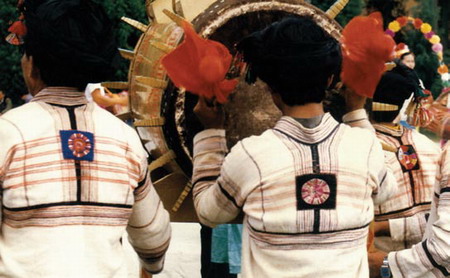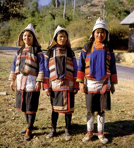 居住在中国西双版纳密林中的基诺族,由于受地理环境的影响,基诺族有着自己独特的服饰。一般来讲,男子头上包白色或黑色头巾,上身着自制白色间加红线条的粗布对襟上衣,穿黑色粗布长裤。女子的服饰相对要复杂得多。女子不分老少,头上都戴白色尖顶的三角帽,也有黑色的,但黑色的帽子上加一些各种颜色的毛线作装饰。上衣多以白、蓝、黑色为主,领口、腰围、北部和袖口都绣有各种图案的花纹。未婚女子胸前还系一块棱形胸饰,上面绣有各种花纹,有的还镶了许多银泡。不论年长年少的妇女,下身穿黑色镶有花条的粗布短裙,打黑色绑腿,据说打绑腿是为防止丛林中蚂蟥的叮咬。|
