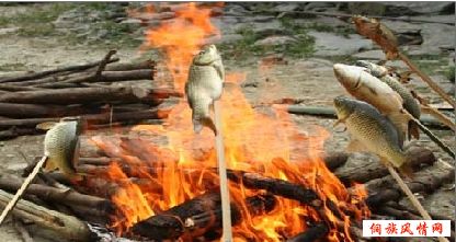 吃“烧鱼”,七十二寨侗族叫“计坝机”,一般是在坡上去吃,也有在家里吃。到坡上去吃别有一番情趣。秋收季节,稻谷打完,只剩下水田里的一点糯禾后,这里的侗族群众便一家男女老少带着蒸好的糯米饭、醇香的米酒和餐具等,同时还要邀请亲朋好友,特别是要请上亲家,一同去坡上的禾田折禾吃烧鱼,庆祝丰收。他们一边折禾一边捉鱼,把捉来的又肥又大的鲤鱼,用木姜树木棒插入鱼的口中,手拿木棒一端,将鱼伸入稻草火中慢慢烤熟,这样木姜香味渗入鱼肉内。然后趁热拿到锅里或盆中与配料、香料和一点凉水拌匀。参入的配料、香料有火烧过的半青半红的辣椒、西红柿和盐巴、昧精、生姜米、大蒜米、花椒粉以及用手揉搓软化并切好的韭菜、蔓蒌(侗语,一种野生的毛毛菜)、鱼蓼、折耳根叶、野芹菜、滇兵菜(一种野菜,又称亮广菜或火烧菜)、广菜等。这道菜既有鱼味,又有野菜味,可口宜人。烧鱼、酒饭摆在田边,先是掌家人和掌家人的亲家站在一起念上吉祥话语,敬上天地、祖先和各路神仙,祈求来年风调雨顺,禾谷满仓,吃不完,有结余。这一礼仪完毕后,才宣布大家可以吃饭。