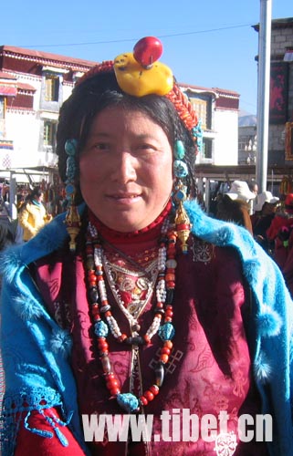 而在草原、牧场上,女性的服饰则具有浓郁的草原气息,光皮藏袍镶嵌彩色宽边,腰间挂着各种银质装饰品。女人们把头发梳成细辫披在身后,发披缀满珊瑚、贝壳、松石和银饰。藏历新年期间,八廓街里的盛装牧女,成群结伴,长袍曳地,在朝佛的路上款款而行,满身的佩饰伴着隐约的诵经声发出悦耳的声音。